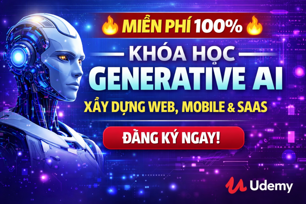 Hiện tại, Udemy đang mở miễn phí 100% khóa học cực kỳ giá trị dành cho những ai muốn học Generative AI và ứng dụng AI vào xây dựng sản phẩm thực tế như website, ứng dụng mobile và SaaS.
