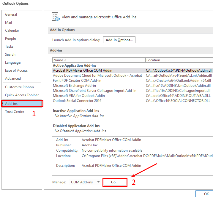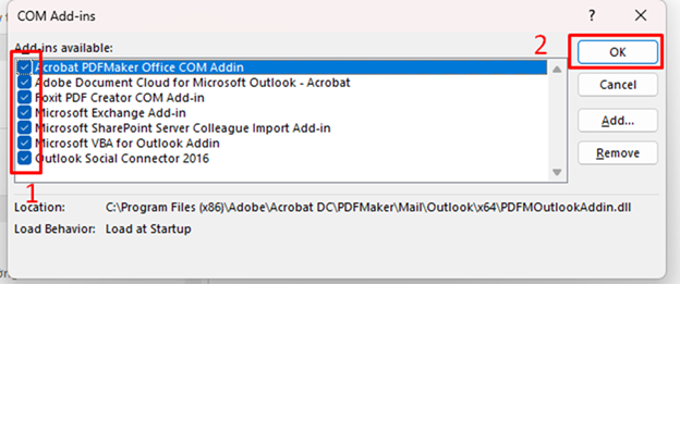Nếu Outlook mở được bình thường ở Safe Mode → chắc chắn lỗi do Add-in.