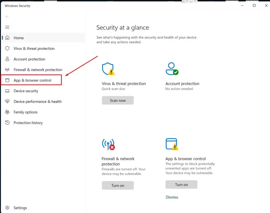 Chọn App & browser control (Kiểm soát ứng dụng & trình duyệt)